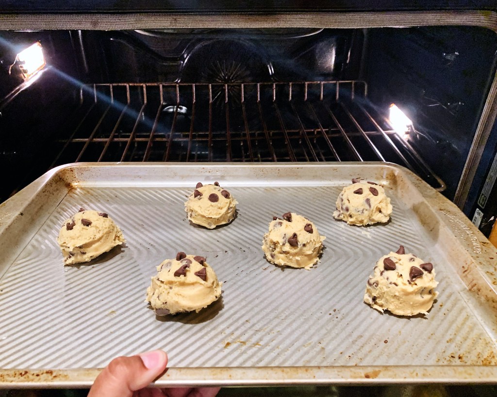 - Using an ice cream scoop, place dough 2 inches apart on a baking sheet (using an ice cream scoop allows for big cookies that get crisp on the edges and stay chewy in the middle)