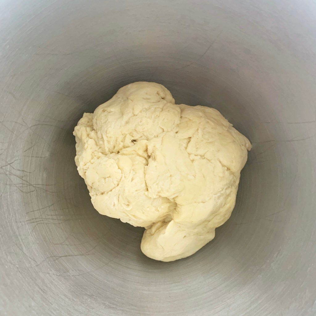 - When the yeast mixture is ready, add it to the stand mixer and knead everything on low for 10-15 minutes – until the dough comes together and no longer sticks to the sides of the bowl. See image below for reference.